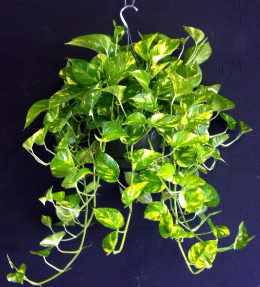 Golden Pothos (Ivy) will happily sit atop a bookcase and hang its leaved tendrils down as far as you allow. It likes to stay moist, so water it frequently for strong growth. It really is the plant that keeps giving, as any cuttings made to keep it trim will grow roots in water until you’re ready to pot up some new plants.