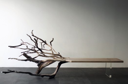 Fallen Tree Bench by French designer Benjamin Graindorge exposes the raw, living material nature of wood in its pure form. As the name suggests, the sculpted natural oak bench is essentially a beautiful fallen tree branch, supported on one end by sprawling branches, and on the other by a borosilicate glass leg.