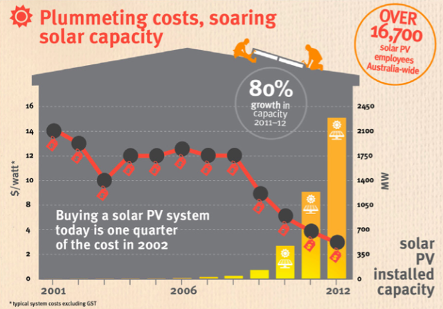 In fact, for Australian households the price of an average solar photovoltaic system has fallen to the point where solar is now competitive in some areas with daytime retail electricity prices.