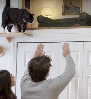 Nestled in a re-purposed storage cupboard, the cat pad features flooring made of cut-to-measure scratch pads, bunk beds, a comfy couch, standard lamp and a framed painting of a pigeon.